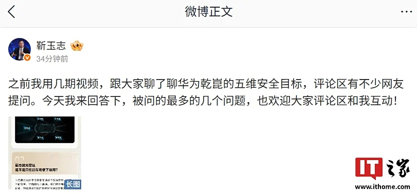 IT之家 8 月 8 日消息,华为智能汽车解决方案 BU CEO 靳玉志今日在微博发布了答网友问,针对华为乾崑的五维安全目标的相关问题进行了解答。